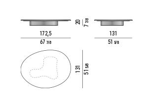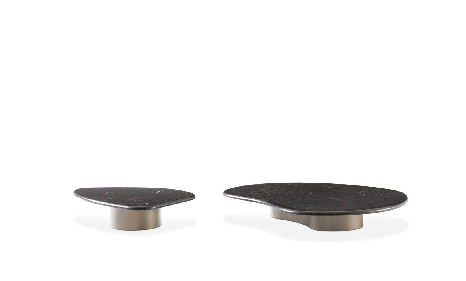 The central stainless steel frame supports the stone top with rounded edges. The organic volumes and curvilinear silhouette make these outdoor coffee tables highly versatile, easy to overlap eachother and combinable with furnishings of different styles.