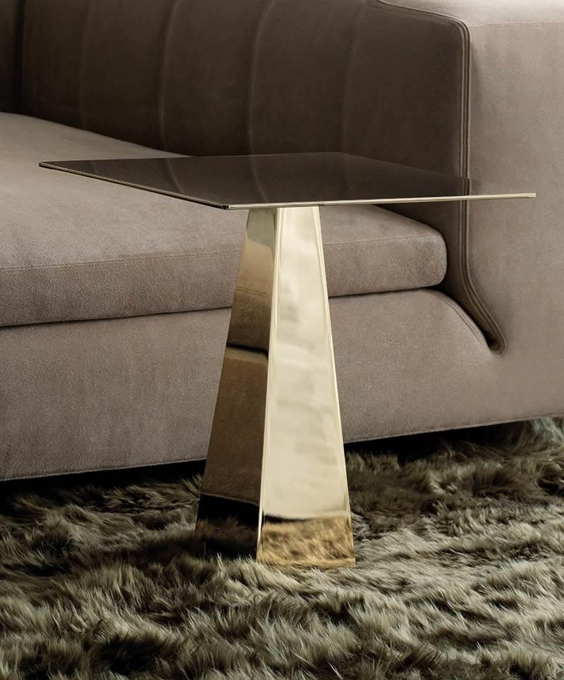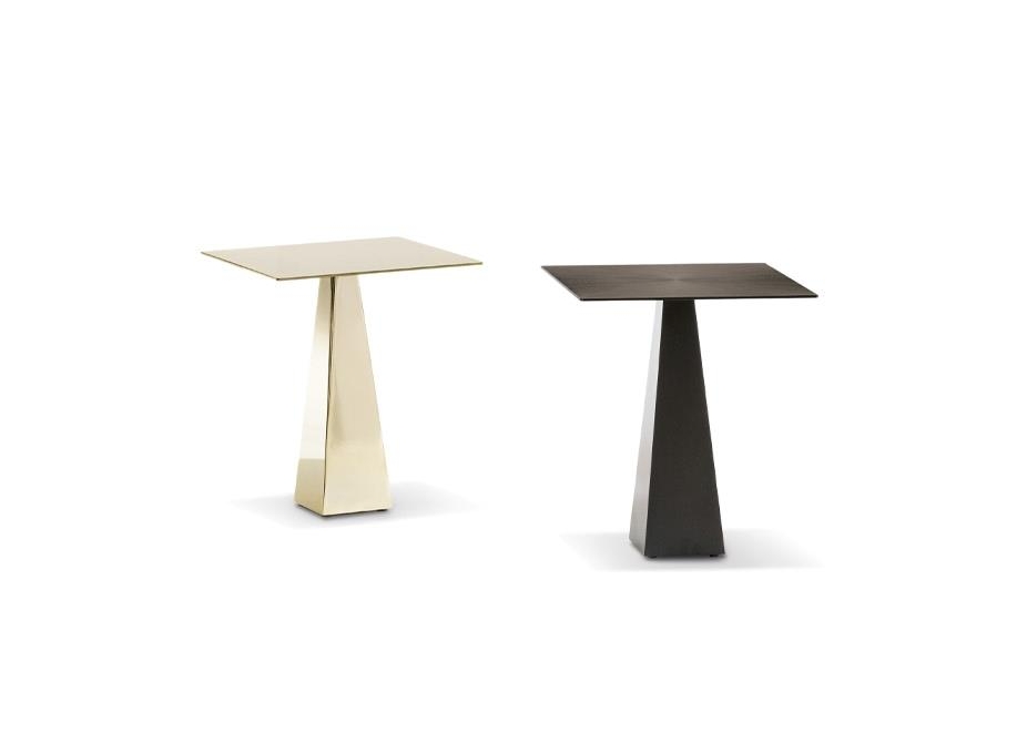 Inspired by modernism, with its clean lines and thoughtful material choices, Cameo is a side table crafted from the combination of two simple elements, resulting in a sculptural and functional piece that reflects the surroundings. The sleek, pyramid-shaped metal base supports the tabletop, which can easily overlap the seats of the sofas.