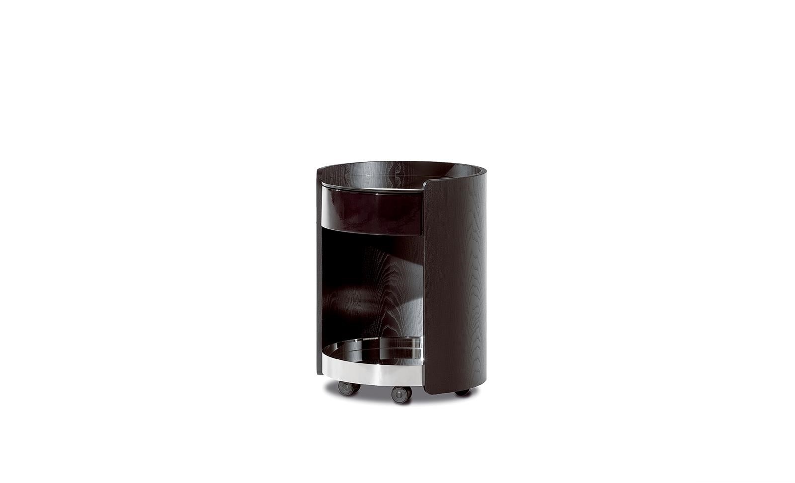 Journey boasts a characteristic cylindrical frame made of lacquered wood that houses a central bottle compartment, a Moka lacquered top drawer and a mirrored top, which is ideal for storing objects.