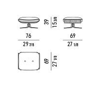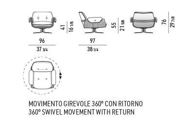 The base of the swivel armchair and footstool is made of folded metal spokes fixed to a vertical support.