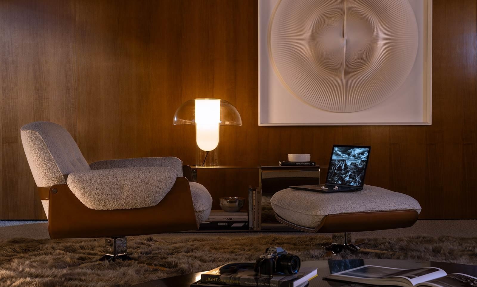 The shell of the seats – available in wood or upholstered in leather – accommodates the seat and back cushions, tailored with stitching, and rises upward to support the soft cushioning of the armrests.