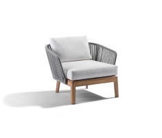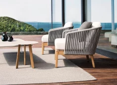 The airy design of the Mood collection and its warm combination of teak and handwoven backs will immediately create an intimate atmosphere on your patio. The rounded design of the durable teak gives the sofa a warm and friendly tone. The weave in Tricord has a very soft touch, but can nevertheless defy all weather conditions. Tribù has developed a range of natural colours that fit in with any type of outdoor environment. The comfortable outdoor cushions can be left out in the rain, thanks to the ventilating, water-repellent filling. The back cushions are available in various styles to match every taste.