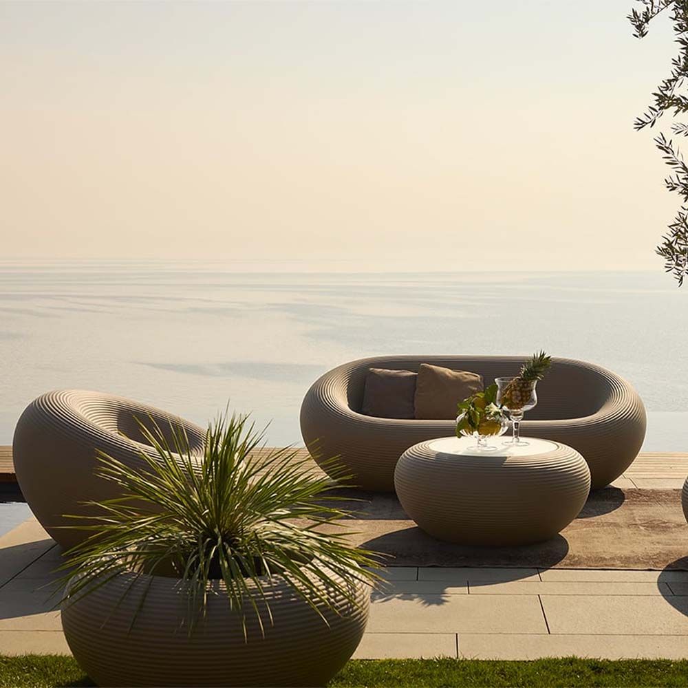 The Nami Sofa is characterized by a linear shape in the center that becomes circular at the two ends. In the middle part of the sofa there are two channels for water reflux. Allows seating of 2-3 people. Available in six colours, three of these have a uniform colour, the other three are obtained from recycling and mixing materials with 2-3 different color tones.