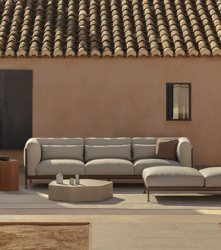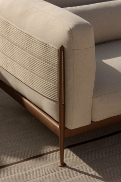 Sofa with structure made of high resistance aluminum profile and legs of injected aluminum, finished with polyester powder. Premium Belt manufactured in textured polypropylene carefully sewn by hand. Possibility of customization through a wide variety of technical fabrics completely suitable for outdoor use.