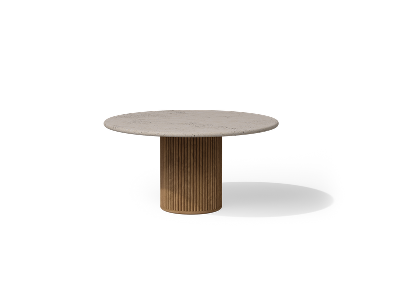 Otto was inspired by a rhythmic ‘ribbon’ pattern, often found in Italian bar counters from the ‘40s. Using merely one simple base element, Otto not only significantly preserves the precious teak wood. Like an ancient architectural pillar, the robust yet elegant patterned base supports a floating round tabletop, available in ceramics and natural travertine, making its durable and timeless design versatile to many outdoor settings.