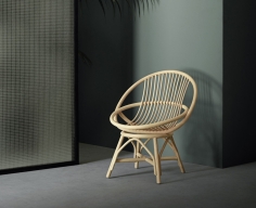 Armchair with structure made of peeled and tinted natural rattan 28 mm/1.1” in diameter. Seat and backrest manufactured in peeled and tinted natural rattan 10 mm/0.4” in diameter. Finished with a three step coating (dye, base coat and top coat) highly resistant to solar radiation thanks to UV filters. Optional cushion with upholstery available in natural or faux leather, virgin wool fabrics, velvet and polypropylene. Protective caps with removable plastic-felt inserts.