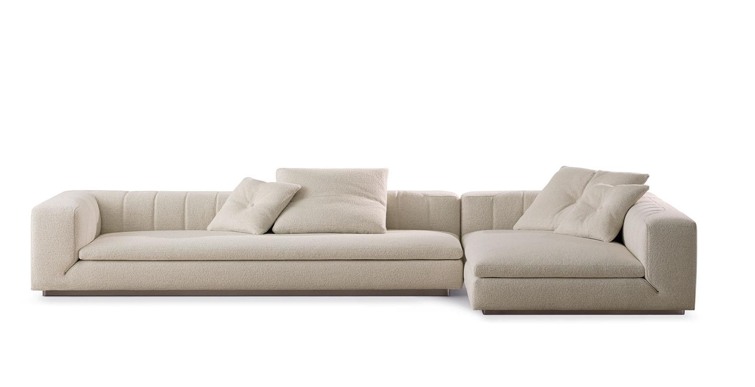 From the recessed metal base, the volume of the seat rises monolithic and solid, enriched with light vertical quilting that gives rhythm to the backrest and armrest. Meanwhile, a deeper profile, upholstered in leather in contrast or colour-matched to the upholstery chosen for the sofa, becomes the distinctive feature of the design. A trace, a continuous line, both curved and straight, that follows the square backrest and armrest, creating a teardrop-shaped cut with a 45-degree inclination at the junction between the armrest and the seat, transforming the sofa into a unique couture-inspired piece. The seat cushion is a single element, partially housed in the padded base, and enhanced with a 5 cm-wide decorative band. The possibility to have elements with two different seat depths not only adds greater comfort to this system, but also creates an interesting interplay of volumes that can be combined.