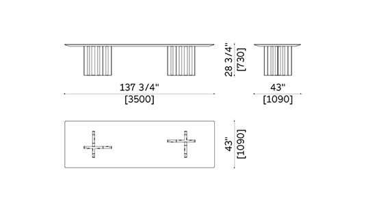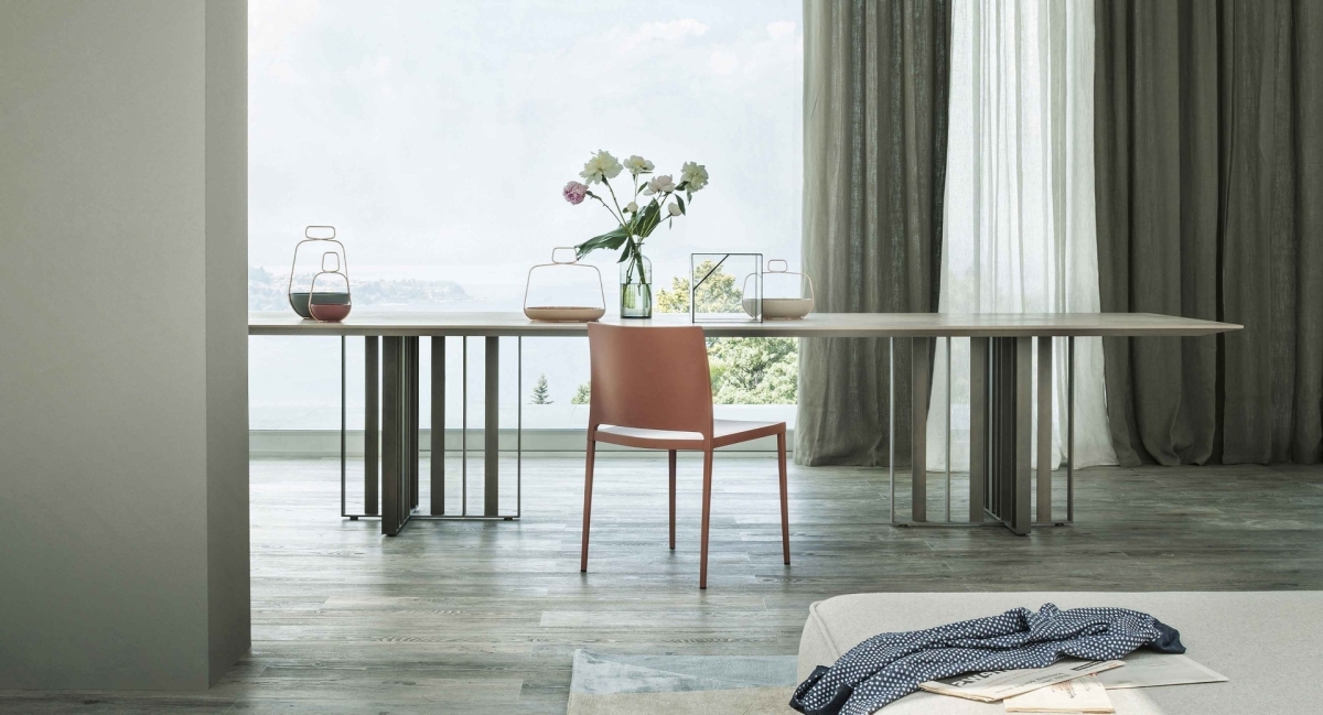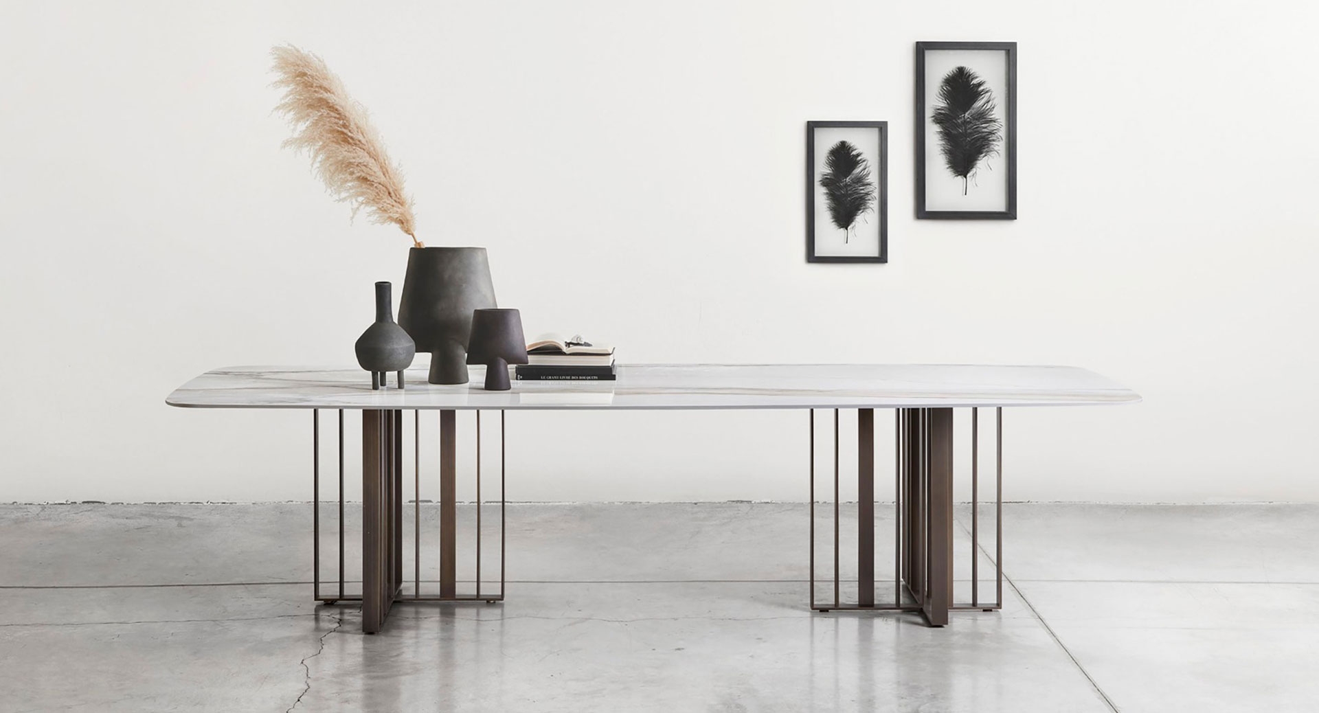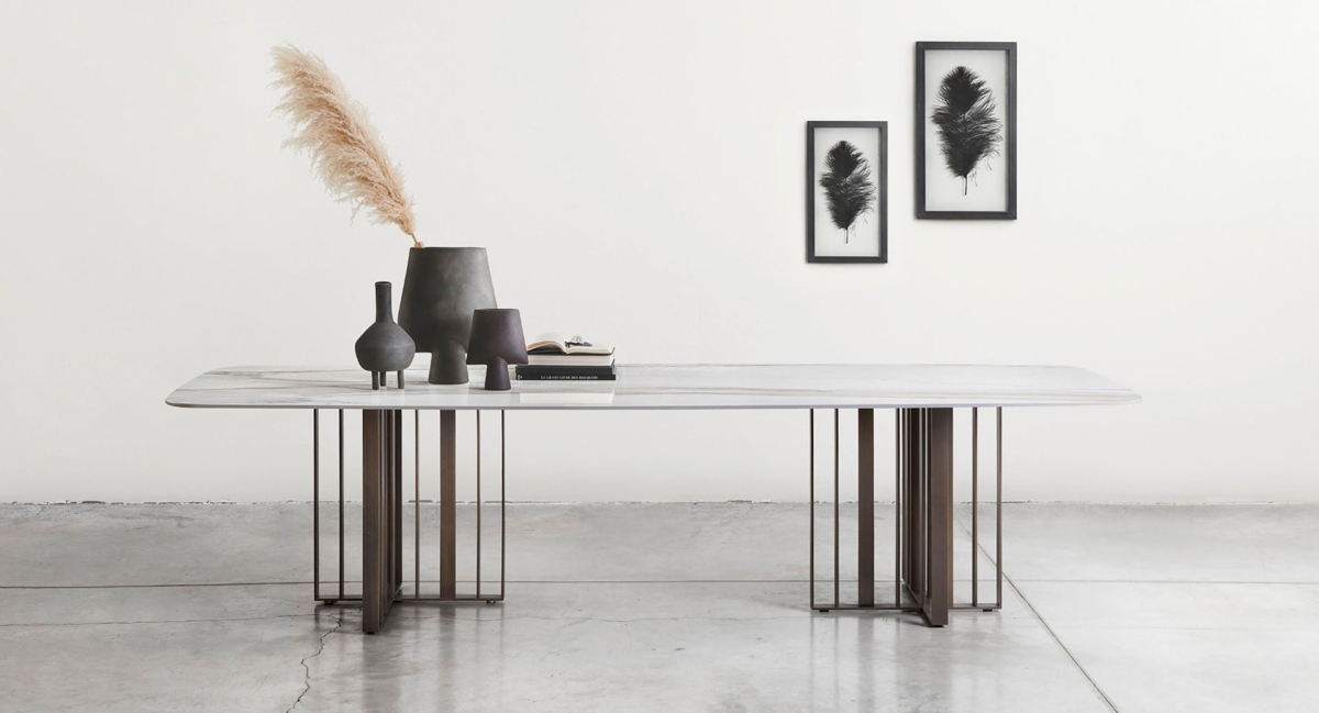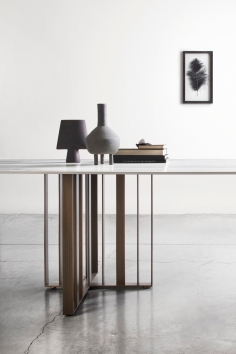 With its sculptural appeal, the Shade dining table is centred around the combination of the base in bronze painted metal and the sleek contrast top. The sculptural pedestal is formed from delicate sheets of metal with a treated bronze finish, arranged in an asymmetrical cross shape. The table top – available in various different materials and finishes – completes the aesthetic effect. The generous size of the table makes it the perfect piece for the centre of a room, whether it be a dining room or meeting room. The name – Shade – is a nod to the shadows created by the metal base.