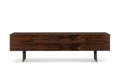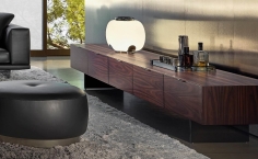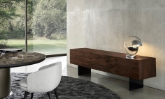 It is conceived as a true piece of architecture, with the storage element in wood or glossy lacquer, available in different finishes, resting on polished Brandy metal blades.