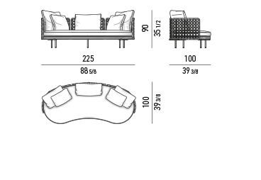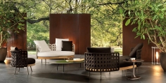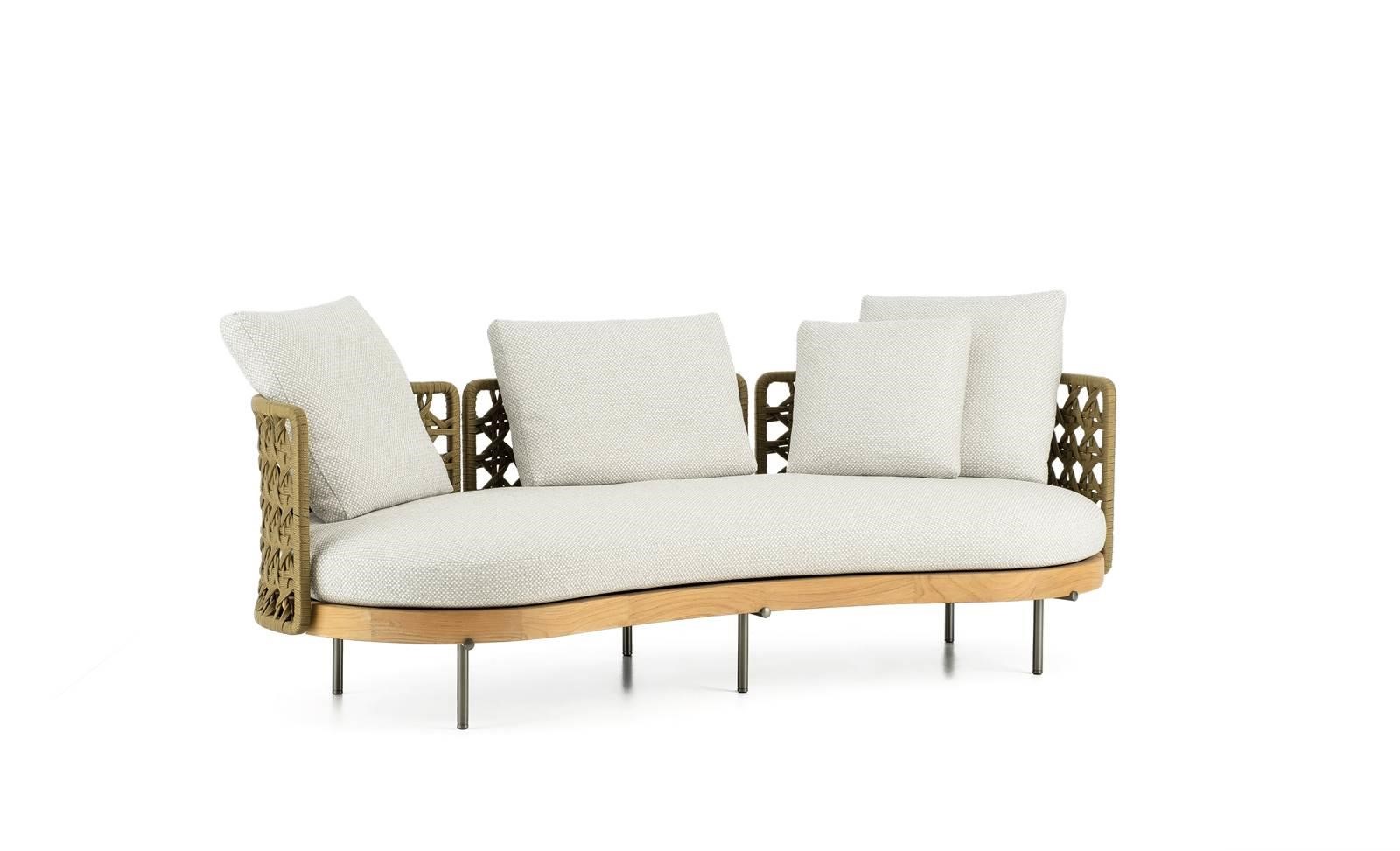 The ethereal appearance of these furnishing pieces dialogues harmoniously with their extreme materiality: the backrest, an enveloping nest, embraces and encloses the soft cushions resting on a solid natural teak frame. A succession of materials with a strong tactile impact and a welcoming feel, as if these sofas were primarily places in which to let go and relax. A design that is at times romantic and at times contemporary, thanks to its compact proportions, it easily fits into the decor on metropolitan terraces and in hospitality settings, satisfying both the most classic and the most modern aesthetic tastes.