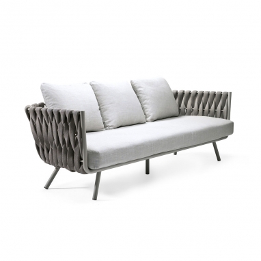 The Tosca outdoor sofa is simultaneously warm and inviting, stylish and intriguing. It was the first time TRIBÙ called upon a female designer to draw an outdoor furniture piece and that is evident in the design. Rounded forms, tapered legs and an elegant seating shell in powdercoated stainless steel, upholstered with extra-wide braiding. The material for the braiding is genuinely innovative : foam mousse is encased in a seamless sheath of knitted textilene and polyolefine which makes the material weather-resistant, but also surprisingly soft to the touch. The seating comfort is especially pleasant, thanks to the comfortable outdoor cushions.