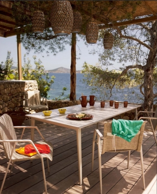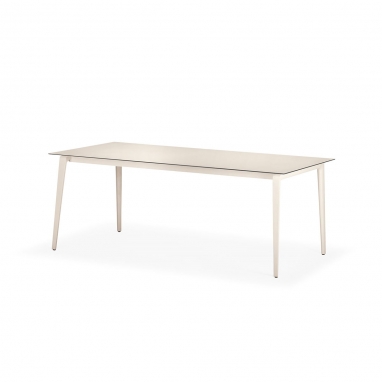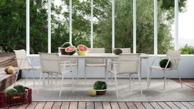 WA by Toan Nguyen is a contemporary collection of dining tables with sculptural appeal. Designed in dynamic lines, the die-cast aluminum legs of the longest table (2.5m/98½“, with a slatted teak tabletop) have lately been repositioned to now seat up to eight diners. WA tables are available in three different sizes and a wide choice of tabletops consisting of HPL, glass or teak. They are complemented perfectly by all DEDON armchairs.