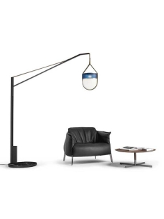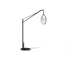 The floor arm lamp consists of a single extra large pendant lamp. The supporting bar is in brushed burnished steel. The Cuoio Saddle Extra leather strap to which the light fitting is hooked continues down to the base, covering the bottom part of the steel mount. The bottom consists of a circular base in semi-polished Nero Marquina marble topped with a metal counterpoise. The marble base has a sheet metal trim. All metal details of the base have a brushed burnished finish.