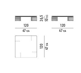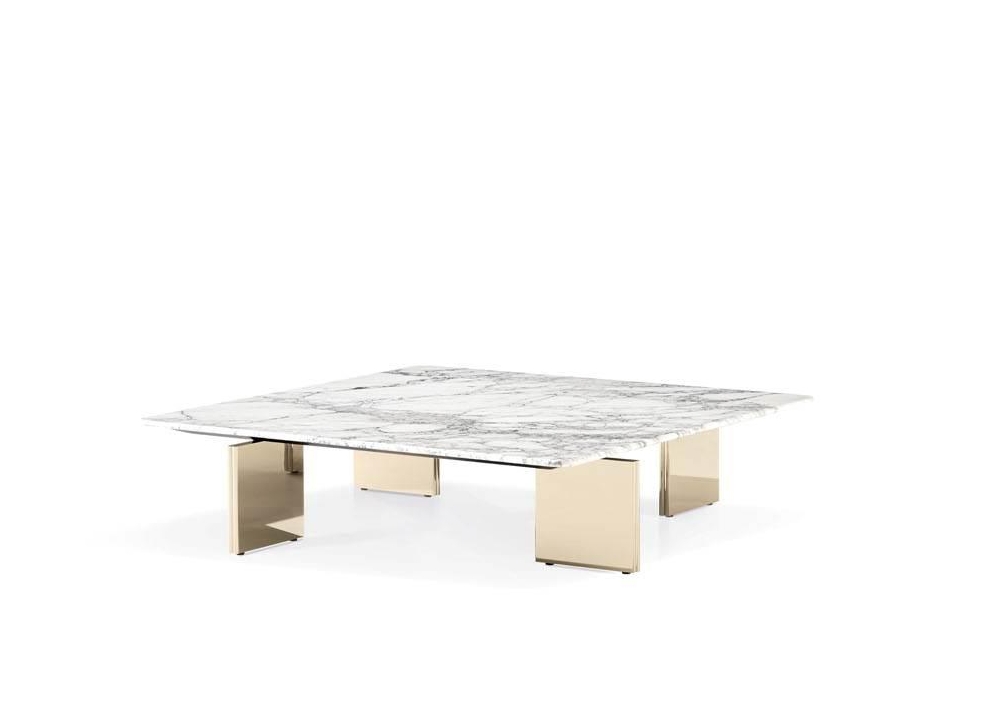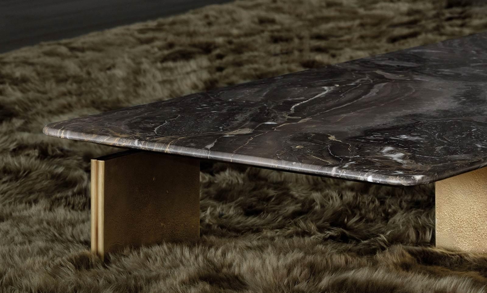 The Yves family of coffee tables, designed by Hannes Peer in perfect aesthetic continuity with the Yves seating system, features a square, rectangular or round top that seems to float on the signature double shaped rounded legs, which run continuously along the base and are available in aluminium Black chrome, Champagne-colour chrome finish or in acid-etched brass-plated aluminium with an elegant yellow-gold finish.